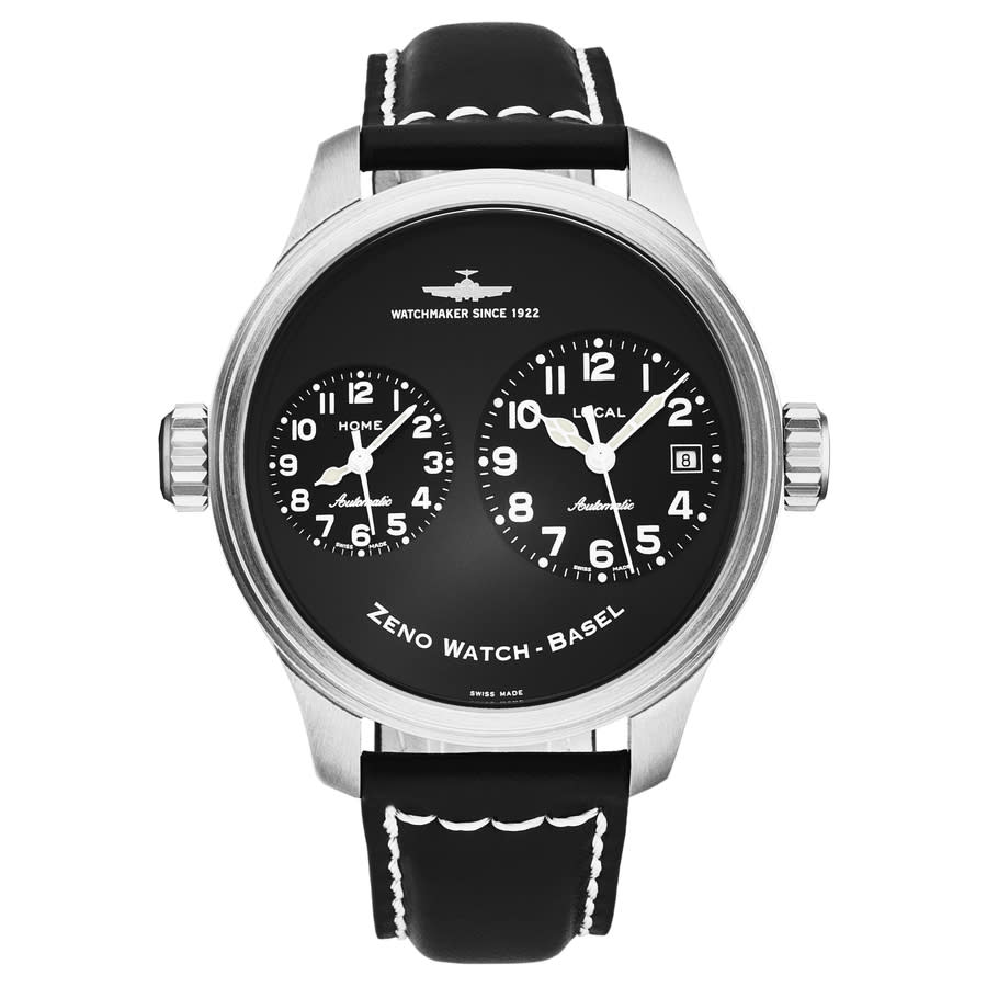 Silver-tone stainless steel case with a black leather strap. Fixed silver-tone stainless steel bezel. Black dial with silver-tone hands and Arabic numeral hour markers. Minute markers around the outer rim. Dial Type: Analog. Luminescent hands and markers. Date display at the 3 o'clock position. ETA Caliber 2671 Automatic movement, containing 25 Jewels, bitting at 28800 vph, and has a power reserve of approximately 38 hours. Scratch resistant mineral crystal. Pull / push crown. Solid case back. Round case shape, case size: 47.5 mm, case thickness: 15 mm. Band width: 22 mm, band length: 8 inches. Tang clasp. Water resistant at 30 meters / 100 feet. Functions: date, hour, minute, second. Additional Info: hours, minutes, seconds, date, dual time. Os Pilot Series. Luxury watch style. Watch label: Swiss Made. Zeno OS Pilot Automatic Black Dial Mens Watch 8671-A1.