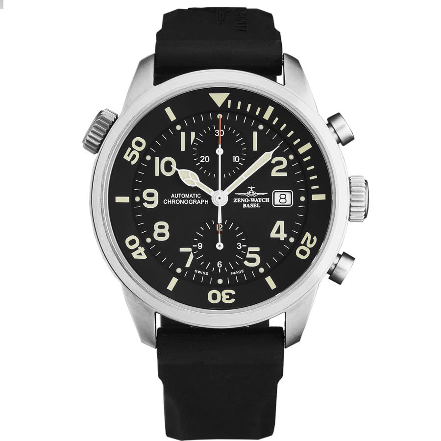 Silver-tone stainless steel case with a black silicone strap. Fixed silver-tone stainless steel bezel. Black dial with silver-tone hands and Arabic numeral hour markers. Minute markers around the outer rim. Dial Type: Analog. Luminescent hands and markers. Date display at the 3 o'clock position. Automatic movement. Scratch resistant sapphire crystal. Transparent case back. Round case shape, case size: 44 mm. Band length: 8 inches. Tang clasp. Water resistant at 100 meters / 330 feet. Functions: chronograph, date, hour, minute, second. Pilot Fellow Series. Luxury watch style. Watch label: Swiss Made. Zeno Pilot Fellow Chronograph Automatic Black Dial Mens Watch 6304BVD-A1.