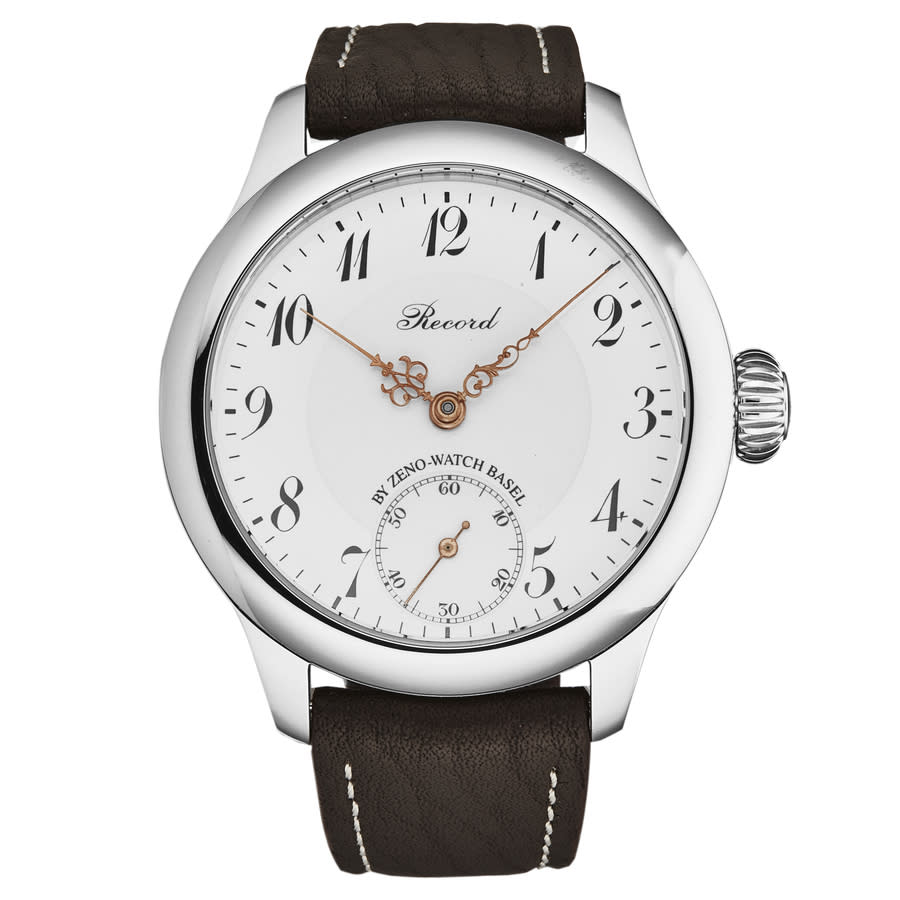 Silver-tone stainless steel case with a brown leather strap. Fixed silver-tone stainless steel bezel. White dial with gold-tone hands and Arabic numeral hour markers. Minute markers around the outer rim. Dial Type: Analog. Hand wind movement. Scratch resistant sapphire crystal. Transparent case back. Round case shape, case size: 49 mm. Band length: 8 inches. Tang clasp. Functions: hour, minute, second. Record Series. Luxury watch style. Watch label: Swiss Made. Zeno Record Hand Wind White Dial Mens Watch 1460-S2.
