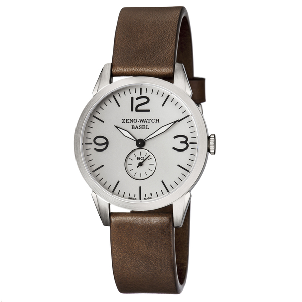 Silver-tone stainless steel case with a brown leather strap. Fixed silver-tone stainless steel bezel. Silver dial with black hands and index-Arabic numerals hour markers. Dial Type: Analog. One- small seconds subdials. Quartz movement. Scratch resistant sapphire crystal. Pull / push crown. Solid case back. Round case shape, case size: 42 mm, case thickness: 12 mm. Water resistant at 50 meters / 165 feet. Functions: hour, minute, second. Casual watch style. Watch label: Swiss Made. Zeno Vintage Line Silver Dial Ladies Watch 4772Q-A3-1.