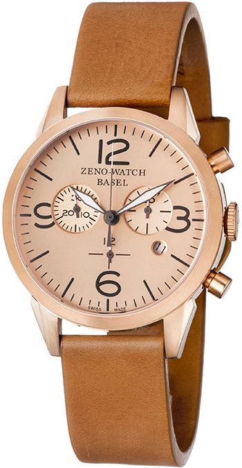 Rose gold-tone stainless steel case with a brown leather strap. Fixed rose gold-tone stainless steel bezel. Rose gold dial with grey hands and index-Arabic numerals hour markers. Minute markers around the outer rim. Dial Type: Analog. Luminescent hands. Date display at the 4 o'clock position. Chronograph - two sub-dials displaying: 60 second, 30 minute. Quartz movement. Scratch resistant sapphire crystal. Pull / push crown. Solid case back. Round case shape, case size: 42 mm, case thickness: 11.5 mm. Band width: 22 mm. Buckle clasp. Water resistant at 50 meters / 165 feet. Functions: chronograph, date, hour, minute, second. Vintage line series. Sport watch style. Watch label: Swiss Made. Zeno Vintage Line Chronograph Mens Watch 4773Q-PRG-A6-1.
